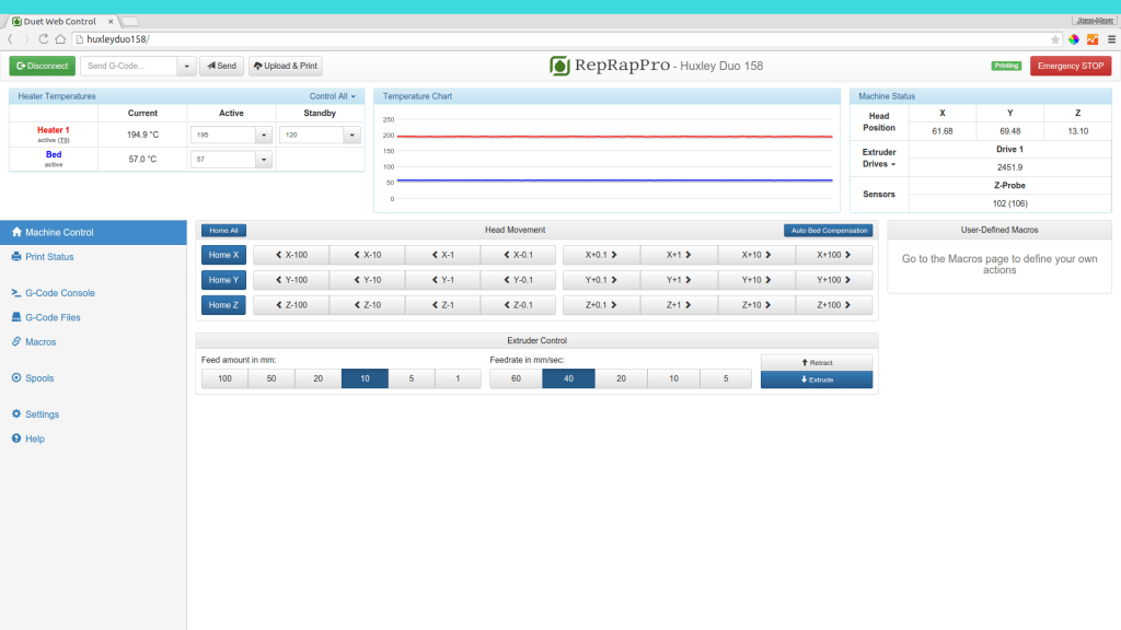 I have to do the m307 h0 d66 command before starting the heatbed process. Duet3d board and paneldue interface. Therefore, you must perform a pid auto tuning to give the firmware a model for bed heater performance. Spurious heater faults and how to avoid them starting at firmware version 1.15, reprapfirmware monitors the heater temperatures to check that they are behaving as expected. 20/03/2017 · the h parameter is used to specify the heater in question, and heater 1 (hotend) is once again default if none is entered... We design and produce the duet3d range of machine control electronics, along with the advanced reprapfirmware and.